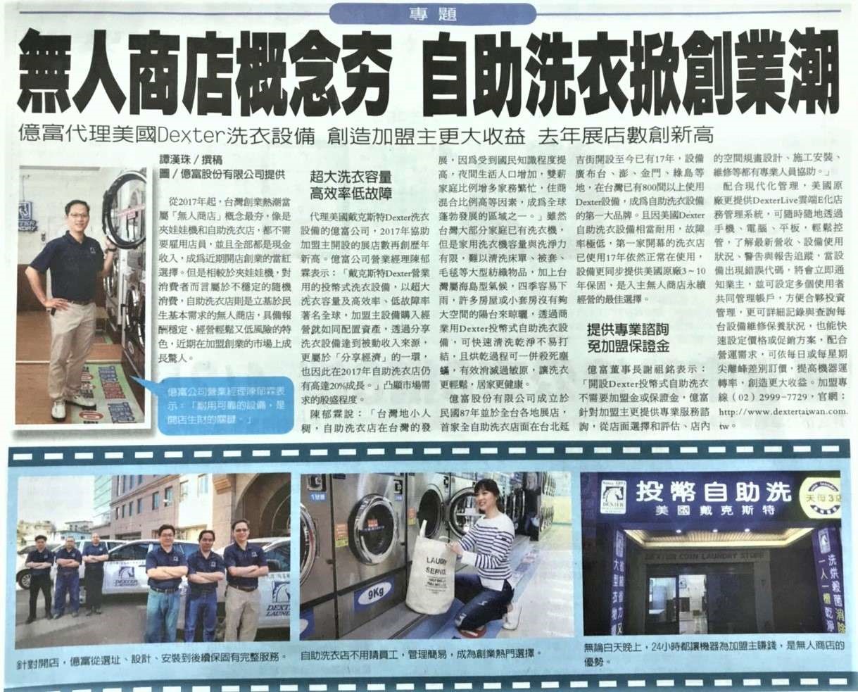億富股份有限公司為美國戴克斯特(Dexter)公司唯一授權於台灣地區總代理商,輔導開店的經驗豐富且致力於投幣自助洗衣事業。